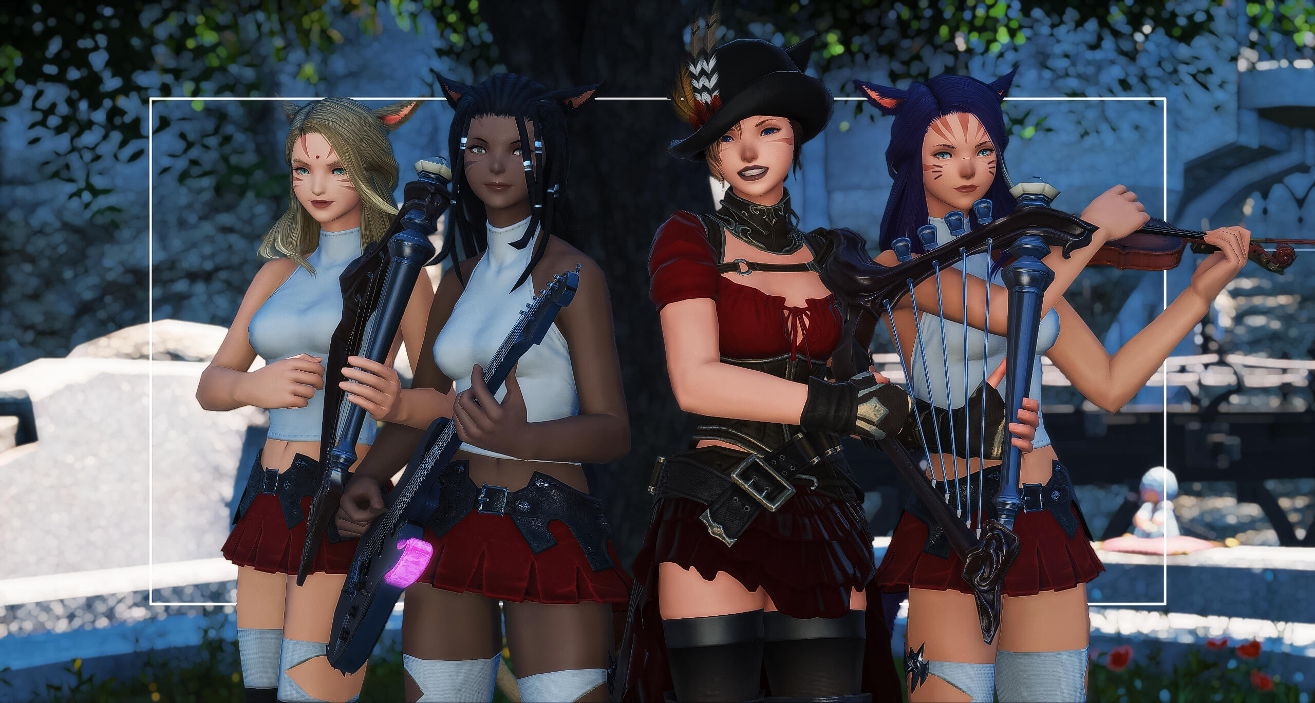 BAND: Nine LivesAge: ??Pronouns: She/HerCharacter Race: Miqo'teRole: BardBio: Heya, I'm Ilyeana! I spend my time in Eorzea hanging out with friends or performing with my bard band, Nine Lives. I like getting dressed up to dance at clubs and have started creating custom fits with blender and other resources. I also like doing my own musical arrangements for the band to play!